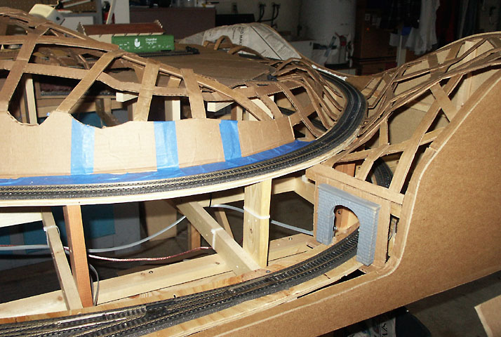 One inch wide cardboard strips were glued to the track boards and layout edges to form a support grid of four to six inch squares. Clothespins were used to hold joints until the glue dried. A layer of newspaper was then added on top of the cardboard grid. A spray bottle of water was used to wet the newspaper to make it conform to the cardboard grid. The newspaper layer served two purposes. First, it helped to better visualize the scenery contours and make any last minute adjustments. Second, it helped keep the wet plaster on the layout and off the floor.