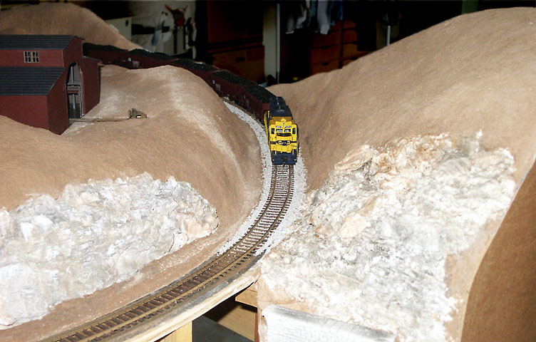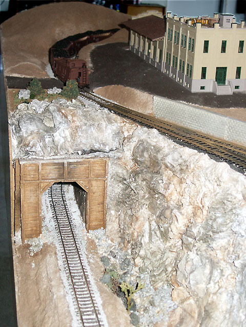 The track was paint with Badger Modelflex Rail Brown (16-175) paint. Since Atlas code 100 track has black ties, the paint was diluted with 2 to 3 parts water and then brushed on over the entire track. This allowed some of the black tie to show through to better represent a creosote tie. The tops of the rails were wiped clean before the paint dried. The track was ballasted with Woodland Scenics 'Gray Blend Fine Ballast' and held in place with concentrated matte medium diluted 1 to 4 with water.For rock areas and cliffs, latex rock molds from Bragdon Enterprises and untinted "Plaster of Paris" were used. Woodland Scenics products and techniques were used for coloring the rocks. Save and color the small pieces of plaster from cleaning the molds after each use and the pieces that break off as the mold is removed. They make great tallus at the base of cliffs and boulders for other scenery areas.